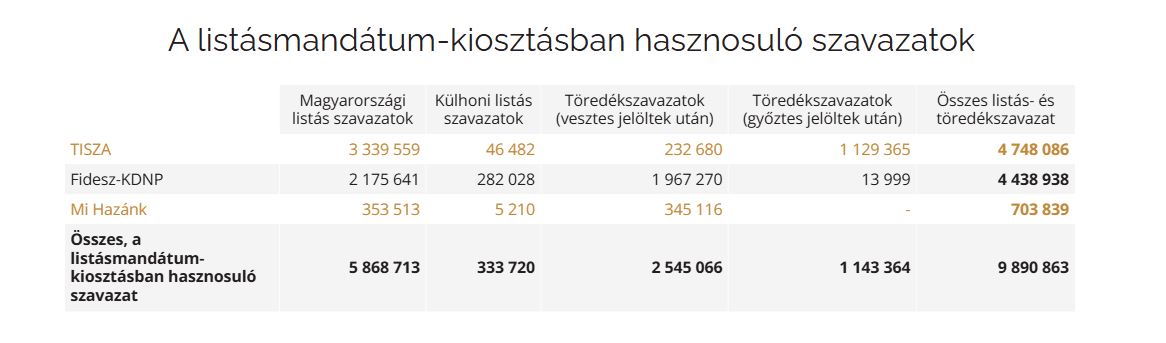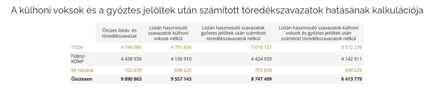 A számítások a szavazatok 99,99 százalékának megszámlálása után, 2026. április 18. 17 órai állapot szerint készültek. Elhanyagolható változások azóta bekövetkezhettek, de ez nem befolyásolja érdemben a kalkulációt.